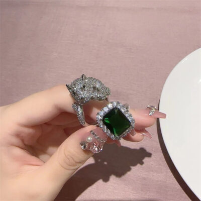 Nhẫn ngọc lục bảo sang trọng phong cách cổ điển Pháp dành cho nữ mở đầu màu sắc kho báu da báo Bộ nhẫn có thể điều chỉnh được
