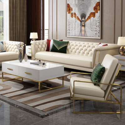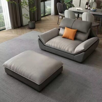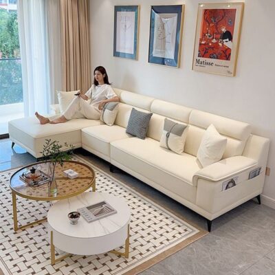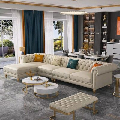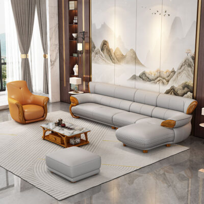 Sofa phòng khách chung cư lớn nhỏ kiểu Mỹ nhẹ sang trọng đầu lớp da bò khóa góc kết hợp ghế đôn đơn giản