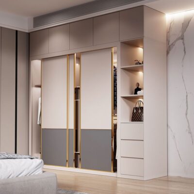 Tủ quần áo cửa trượt nhà phòng ngủ hiện đại tối giản cửa trượt kem cà vạt bàn máy tính bàn trang điểm ánh sáng tủ quần áo sang trọng