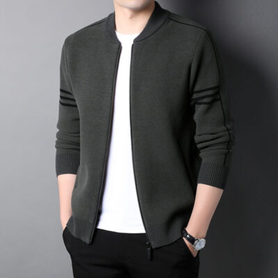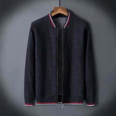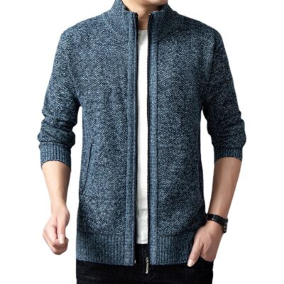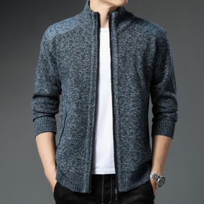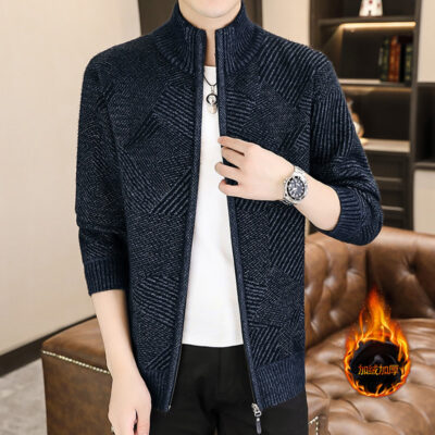 Mùa Đông Nam Dệt Kim Sang Trọng Dày Thường Ngày Một Dây Kéo Nhung Cổ Đứng Áo Len Cardigan Ấm Lạnh Lạnh Áo Len Nam