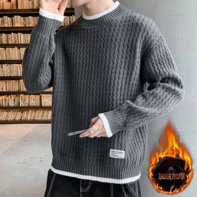 Áo len cổ tròn nam phong cách Hàn Quốc mùa thu đông cộng nhung dày Áo len chui đầu nam dáng ôm áo len cổ lọ