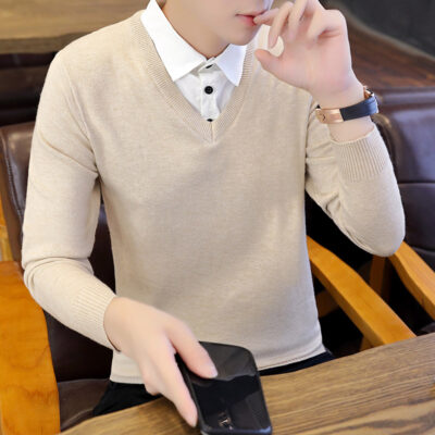 Áo len hai mảnh giả cổ áo sơ mi nam phiên bản Hàn Quốc mùa thu đông xu hướng mới cổ áo giả dệt kim cộng với đáy áo dày nhung triều