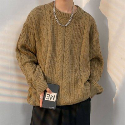 Retro dày xoắn áo len cổ tròn nam phong cách thu đông lười gió ins triều thương hiệu áo len dệt kim áo khoác ngoài áo len