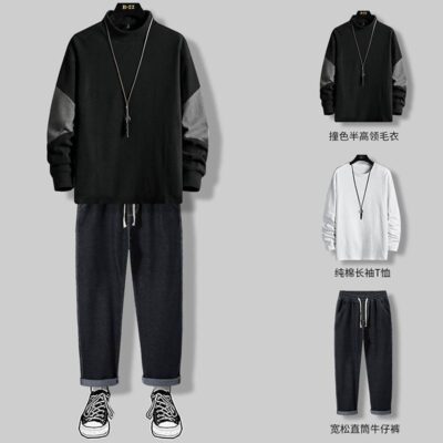 Áo len nửa cổ lọ nam mùa thu đông nối màu tương phản in rời thương hiệu hợp thời trang Bộ quần áo nam với quần áo len dệt kim