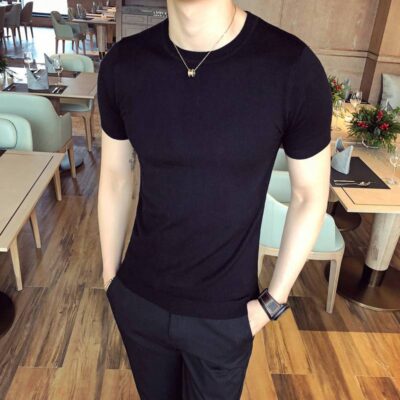 Áo len nam ngắn tay thu đông phiên bản Hàn Quốc cổ tròn mỏng dày màu trơn áo sơ mi dệt kim nửa tay bó sát nam 08